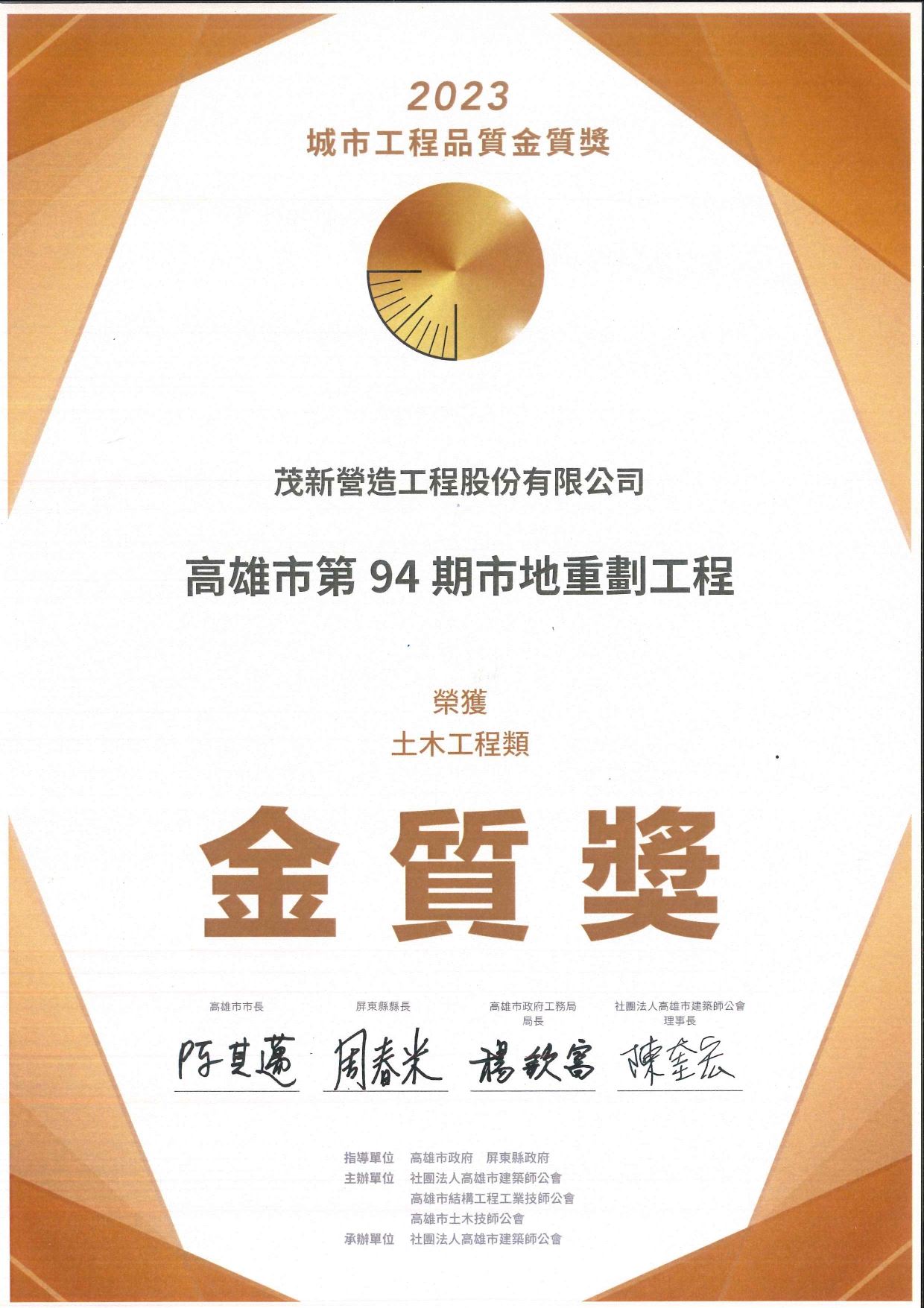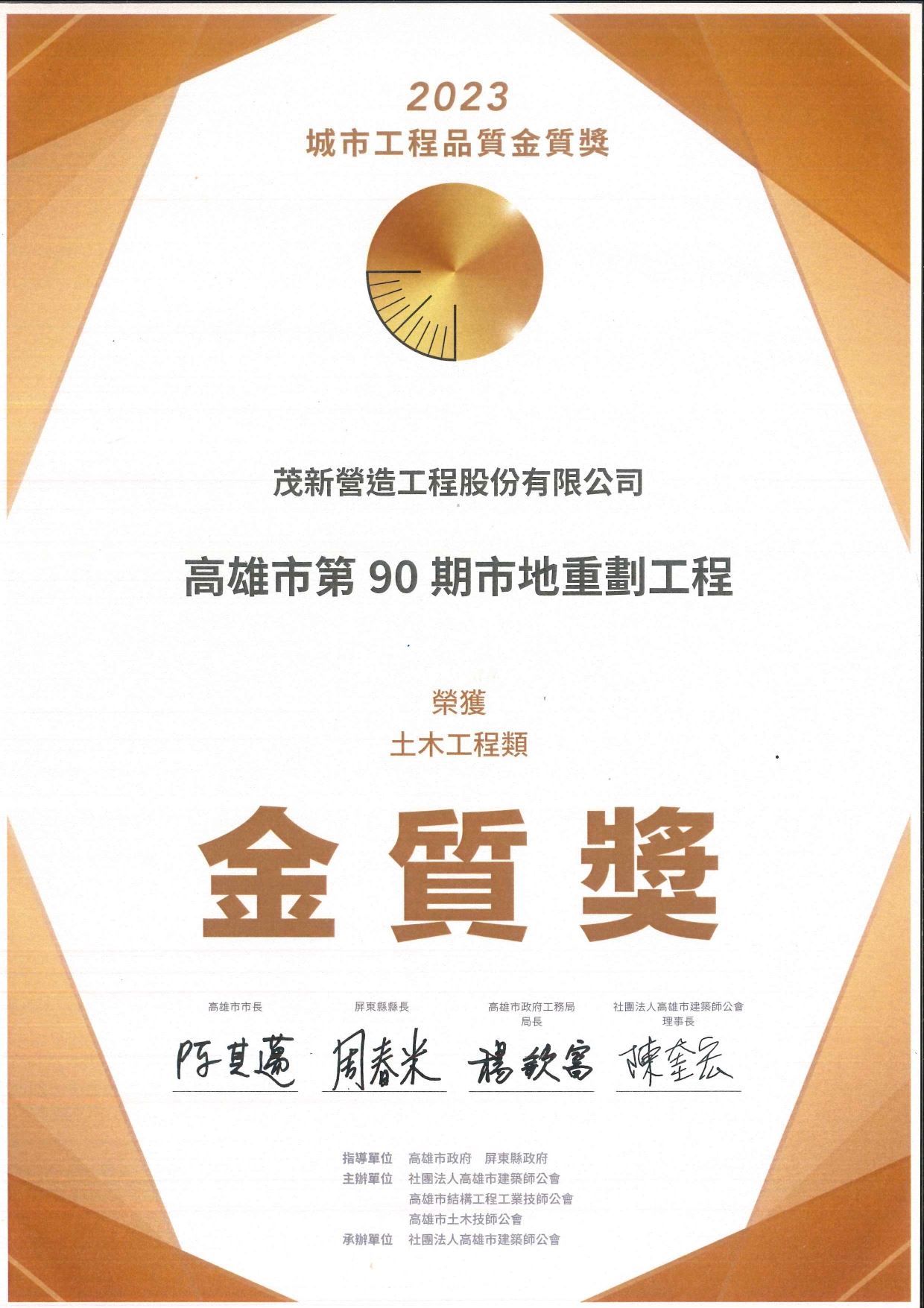 本公司施工「高雄市第90期市地重劃工程」及「高雄市第94期市地重劃工程」-榮獲社團法人高雄建築師公會「2023年城市工程品質金質獎」土木工程類金質獎。